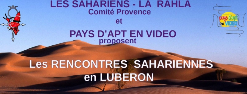 Pays d’Apt en vidéo et Les Sahariens – La Rahla, organisent au début du mois de mai trois journées de projections, débats et expositions consacrés à de multiples facettes du Sahara : caravanes de sel au Niger, volcans du Hoggar, peuple Kel Tamasheq, etc. Ces rencontres se dérouleront à Saint-Martin-de-Castillon (Chapelle des Pénitents). Participation libre. Infos auprès de Pays d’Apt en vidéo (info@aptenvideo.fr) ou du Comité Provence des Sahariens (comiteprovence@les-sahariens.fr Tél. 0688969947).